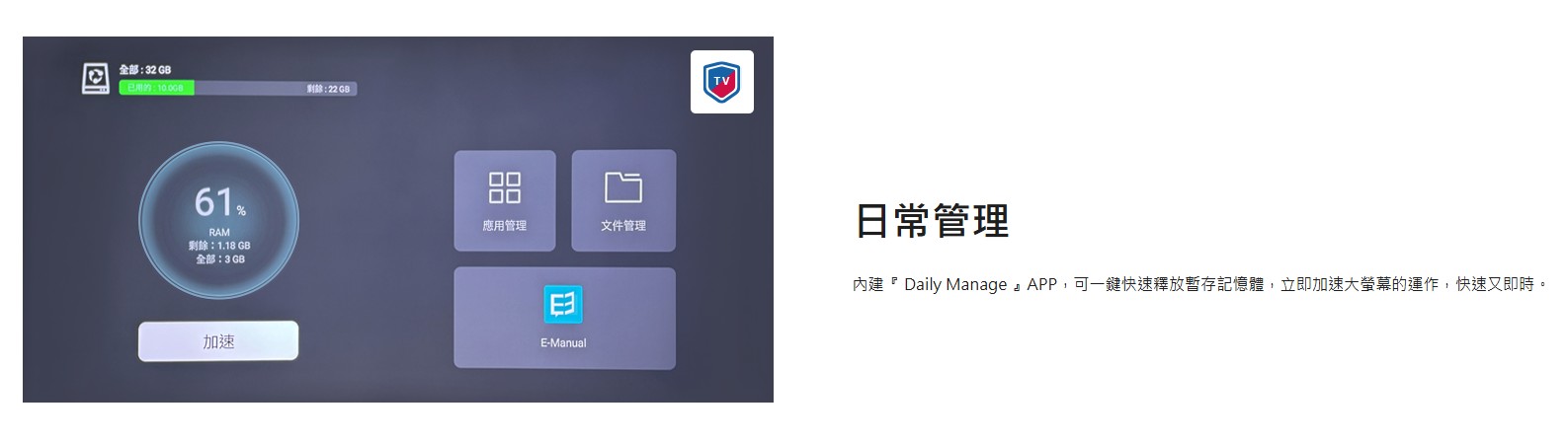 1.按裝以原廠隨機所附之附屬品桌上型腳架施工,現場需電視天線或有線電視訊號來源。