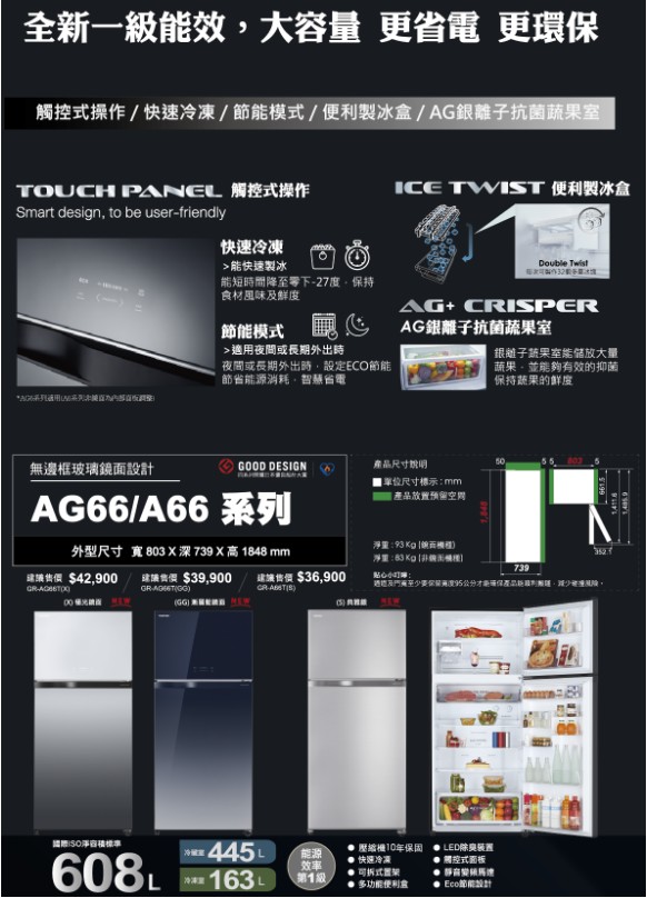 上揚家電-東芝變頻玻璃鏡面系列冰箱608公升(GR-AG66T-GG)